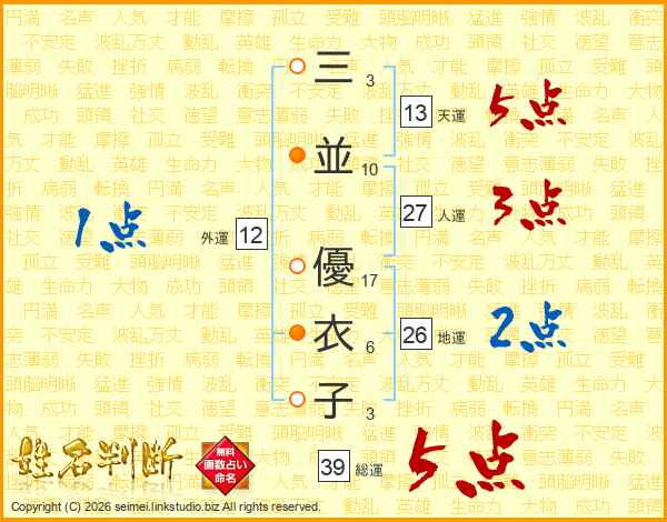 三(3画)並(10画) 優(17画)衣(6画)子(3画)
