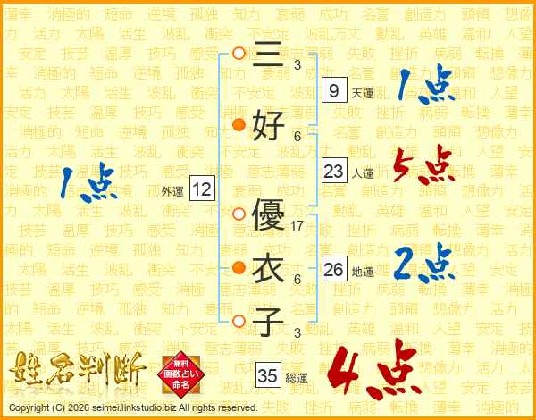 三(3画)好(6画) 優(17画)衣(6画)子(3画)