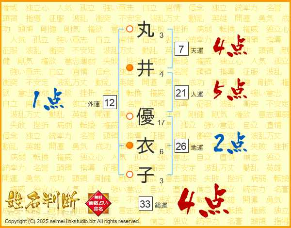 丸(3画)井(4画) 優(17画)衣(6画)子(3画)