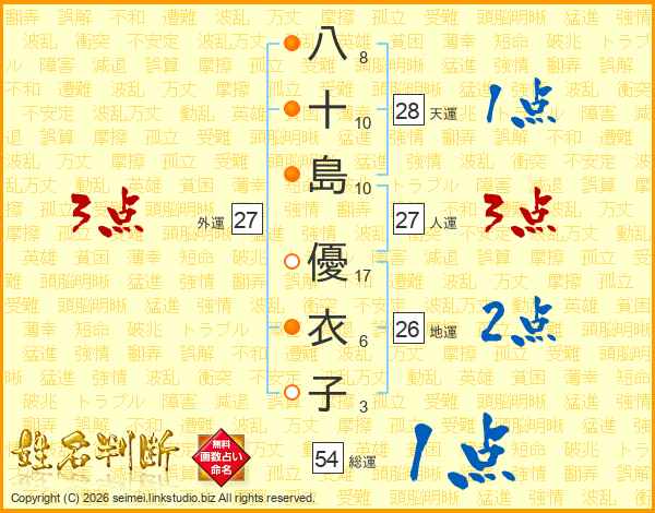 八(8画)十(10画)島(10画) 優(17画)衣(6画)子(3画)