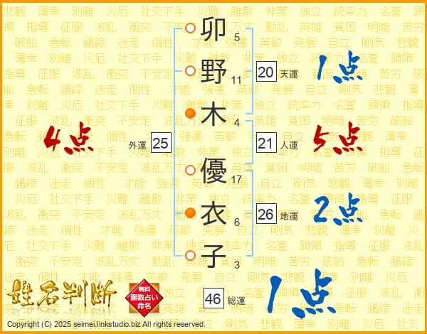 卯(5画)野(11画)木(4画) 優(17画)衣(6画)子(3画)