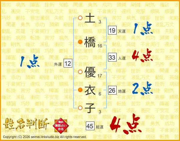 土(3画)橋(16画) 優(17画)衣(6画)子(3画)