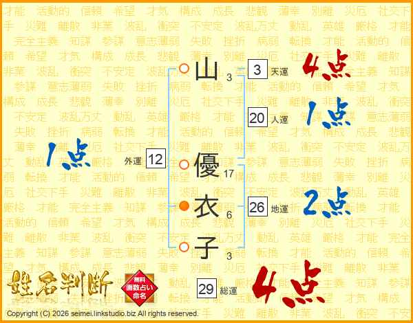生活面を象徴する運勢です。外部から受ける影響力を表し、結婚運、家庭運や職場、環境への順応性を表します。総運から人運を引いた画数。姓や名が1文字の場合を除く。