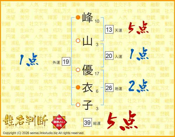 峰(10画)山(3画) 優(17画)衣(6画)子(3画)