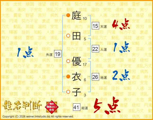 庭(10画)田(5画) 優(17画)衣(6画)子(3画)