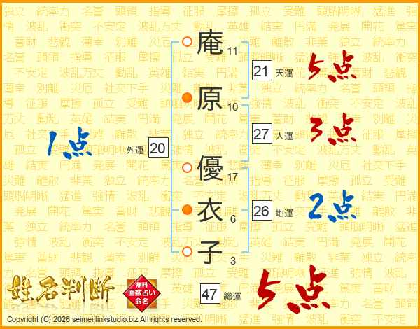 庵(11画)原(10画) 優(17画)衣(6画)子(3画)