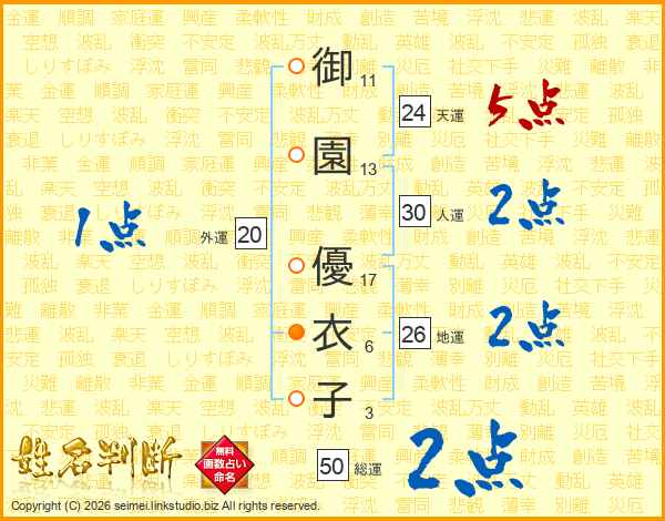 御(11画)園(13画) 優(17画)衣(6画)子(3画)