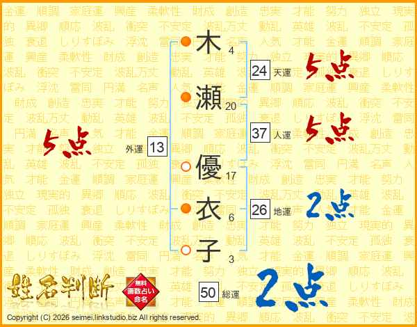木(4画)瀬(20画) 優(17画)衣(6画)子(3画)