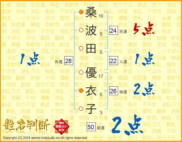 桑(10画)波(9画)田(5画) 優(17画)衣(6画)子(3画)