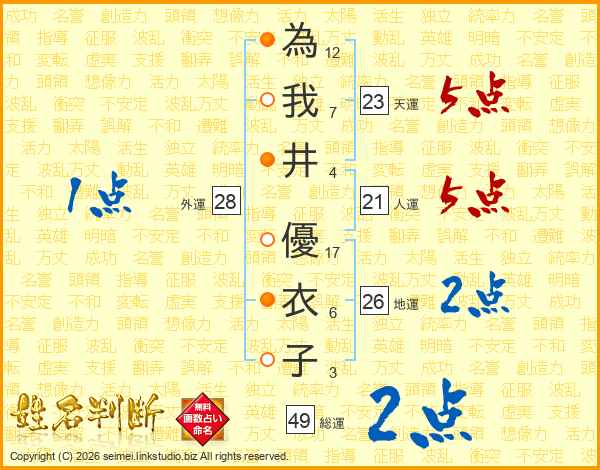 為(12画)我(7画)井(4画) 優(17画)衣(6画)子(3画)