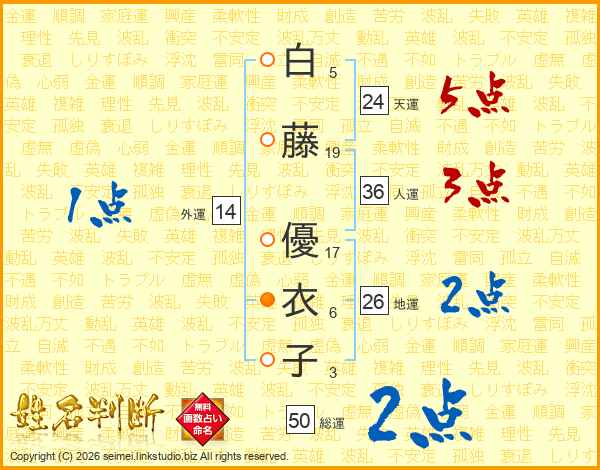 白(5画)藤(19画) 優(17画)衣(6画)子(3画)