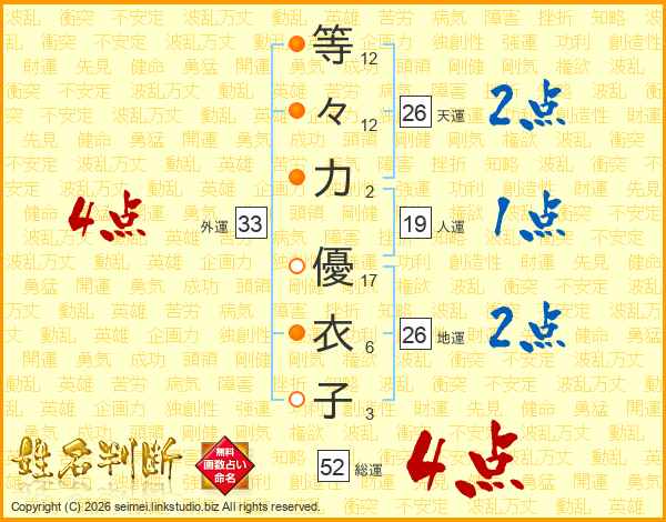 等(12画)々(12画)力(2画) 優(17画)衣(6画)子(3画)