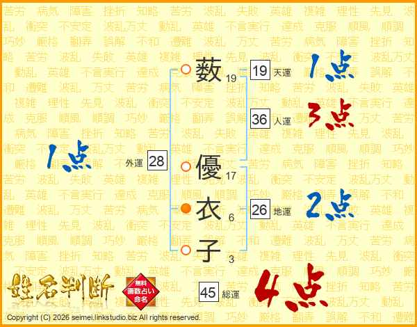 生活面を象徴する運勢です。外部から受ける影響力を表し、結婚運、家庭運や職場、環境への順応性を表します。総運から人運を引いた画数。姓や名が1文字の場合を除く。