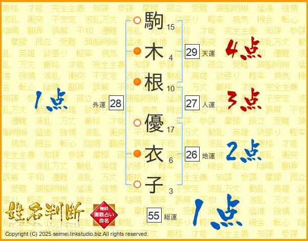 駒(15画)木(4画)根(10画) 優(17画)衣(6画)子(3画)