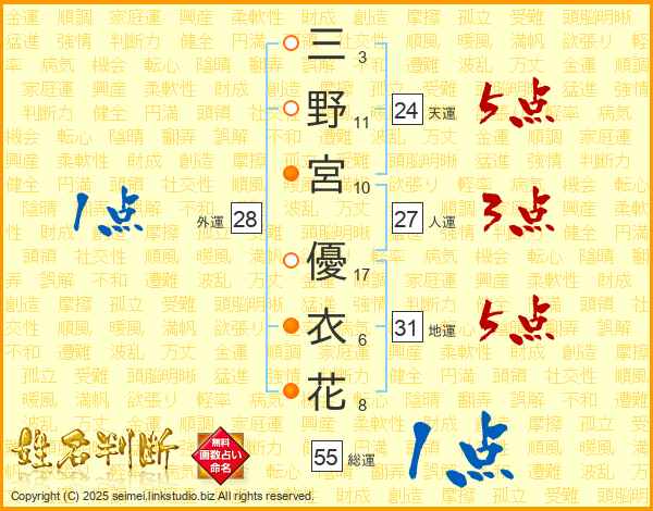 三(3画)野(11画)宮(10画) 優(17画)衣(6画)花(8画)