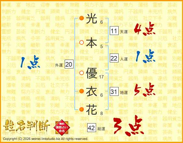 光(6画)本(5画) 優(17画)衣(6画)花(8画)
