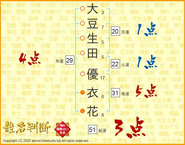 大(3画)豆(7画)生(5画)田(5画) 優(17画)衣(6画)花(8画)