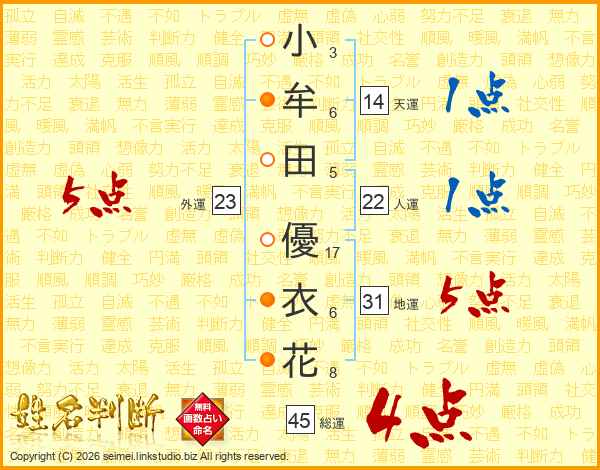 小(3画)牟(6画)田(5画) 優(17画)衣(6画)花(8画)