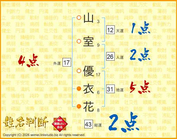 山(3画)室(9画) 優(17画)衣(6画)花(8画)