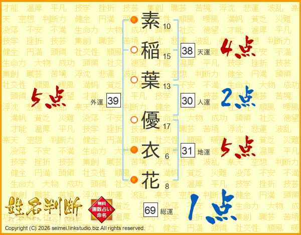 素(10画)稲(15画)葉(13画) 優(17画)衣(6画)花(8画)
