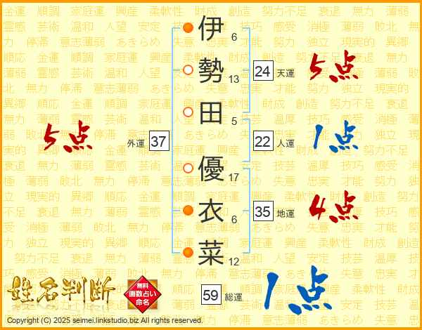 伊(6画)勢(13画)田(5画) 優(17画)衣(6画)菜(12画)