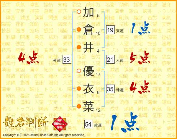加(5画)倉(10画)井(4画) 優(17画)衣(6画)菜(12画)