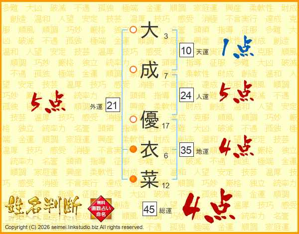 大(3画)成(7画) 優(17画)衣(6画)菜(12画)