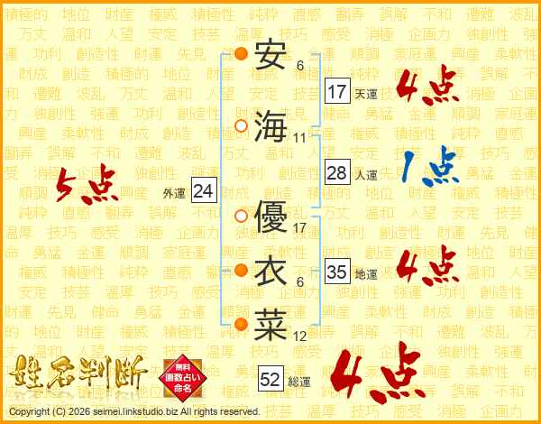 安(6画)海(11画) 優(17画)衣(6画)菜(12画)