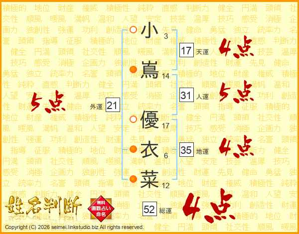 小(3画)嶌(14画) 優(17画)衣(6画)菜(12画)