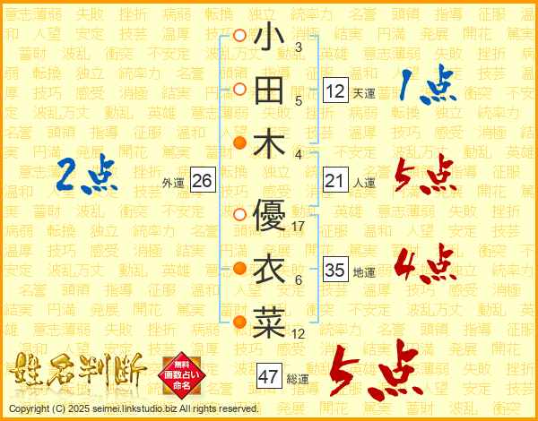 小田木優衣菜さんの総運は47画の5点!
