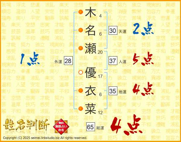 木名瀬優衣菜さんの総運は65画の4点!
