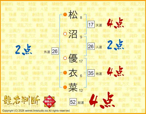 松(8画)沼(9画) 優(17画)衣(6画)菜(12画)