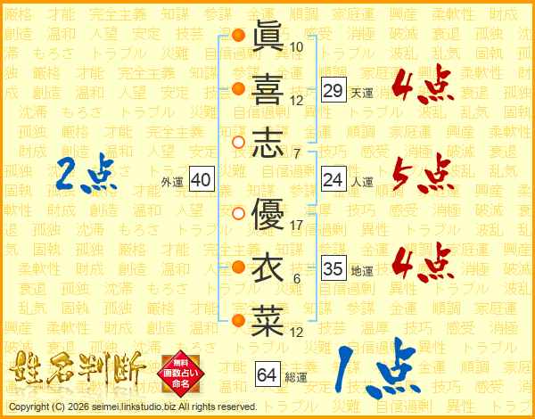 眞(10画)喜(12画)志(7画) 優(17画)衣(6画)菜(12画)