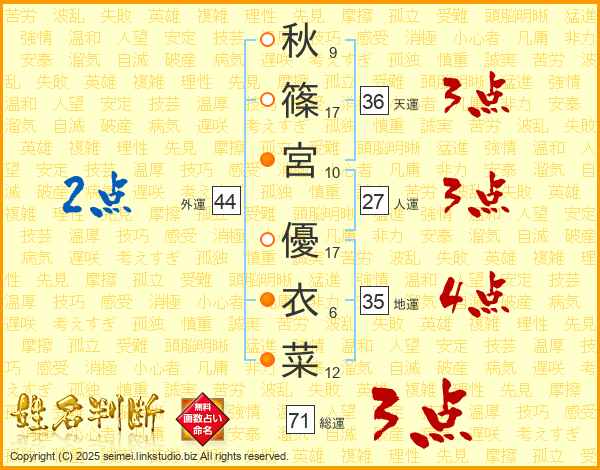 秋(9画)篠(17画)宮(10画) 優(17画)衣(6画)菜(12画)