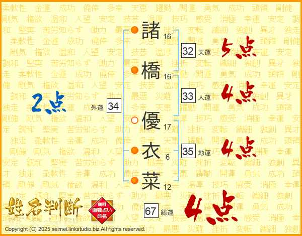 諸橋優衣菜さんの外運は34画の2点!