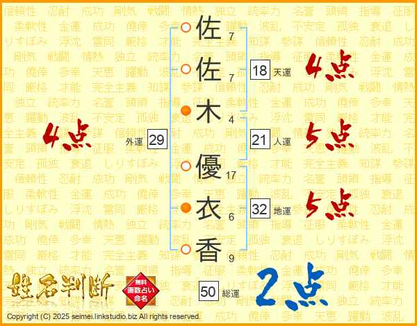 佐(7画)佐(7画)木(4画) 優(17画)衣(6画)香(9画)