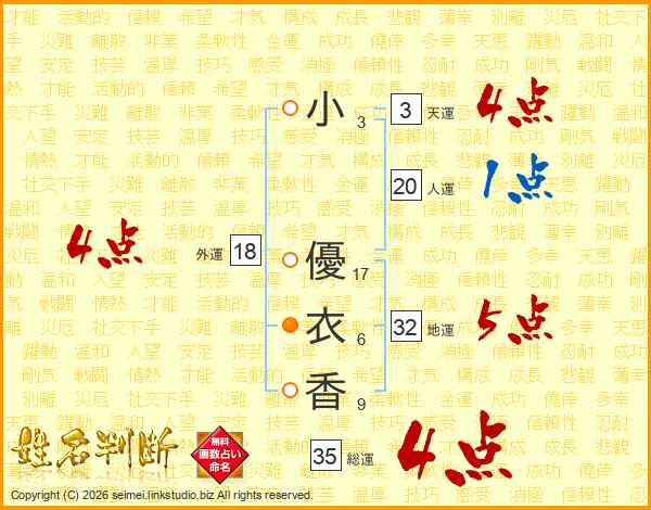 生活面を象徴する運勢です。外部から受ける影響力を表し、結婚運、家庭運や職場、環境への順応性を表します。総運から人運を引いた画数。姓や名が1文字の場合を除く。
