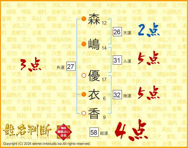 森(12画)嶋(14画) 優(17画)衣(6画)香(9画)