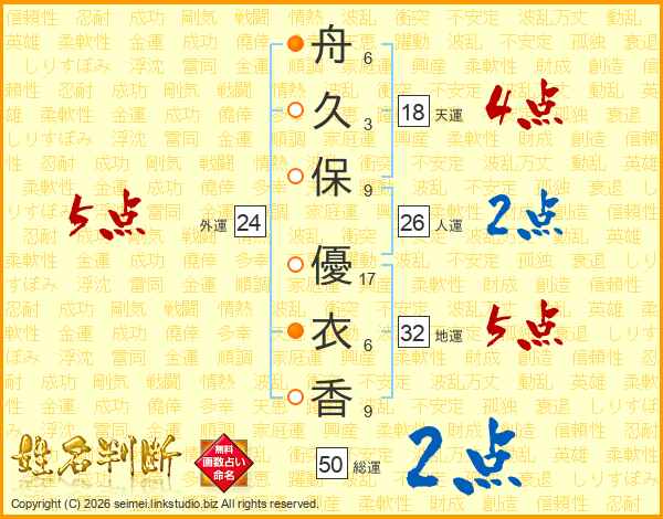 舟(6画)久(3画)保(9画) 優(17画)衣(6画)香(9画)
