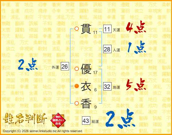 貫優衣香さんの総運は43画の2点!