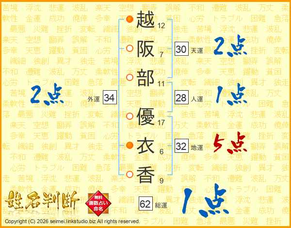 越(12画)阪(7画)部(11画) 優(17画)衣(6画)香(9画)