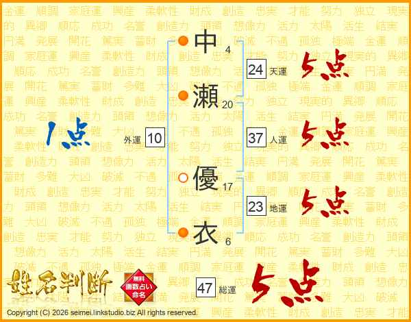 中瀬優衣さんの総運は47画の5点!
