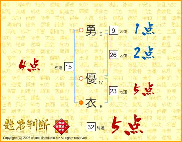 生活面を象徴する運勢です。外部から受ける影響力を表し、結婚運、家庭運や職場、環境への順応性を表します。総運から人運を引いた画数。姓や名が1文字の場合を除く。