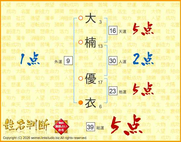 大楠優衣さんの総運は39画の5点!