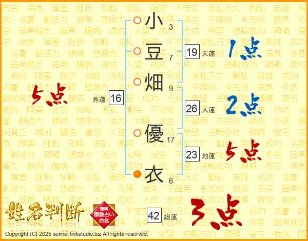 小(3画)豆(7画)畑(9画) 優(17画)衣(6画)