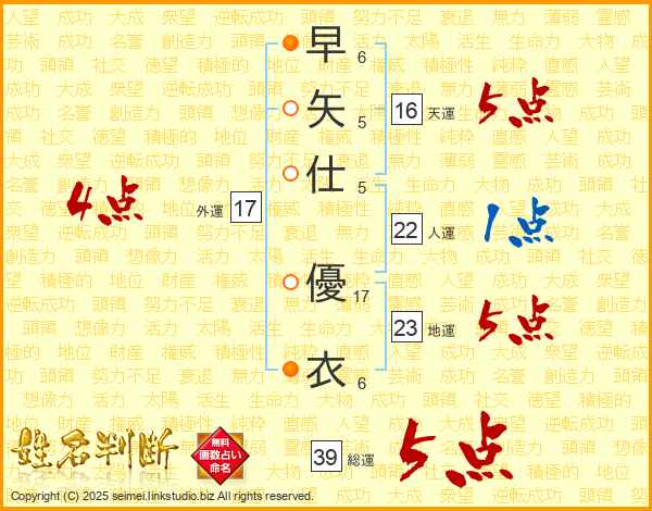 早矢仕優衣さんの総運は39画の5点!