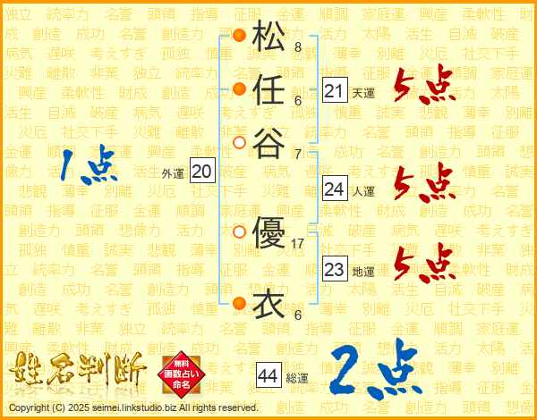 松(8画)任(6画)谷(7画) 優(17画)衣(6画)
