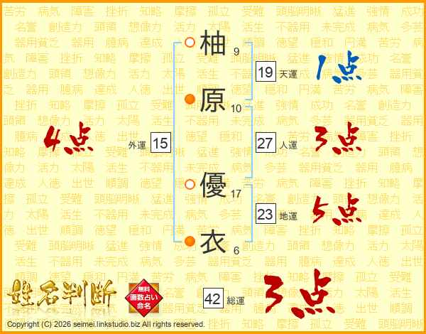 柚(9画)原(10画) 優(17画)衣(6画)