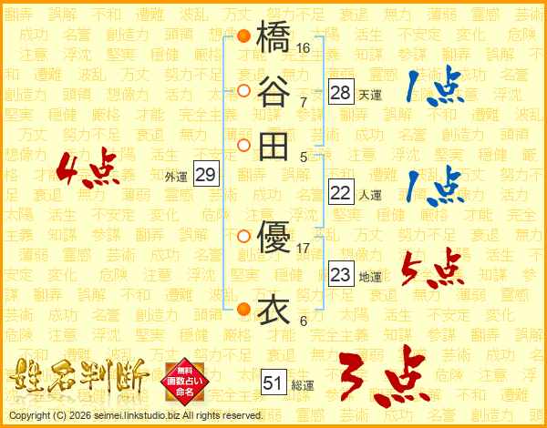 橋(16画)谷(7画)田(5画) 優(17画)衣(6画)