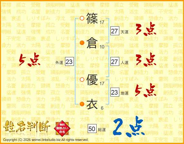 篠(17画)倉(10画) 優(17画)衣(6画)